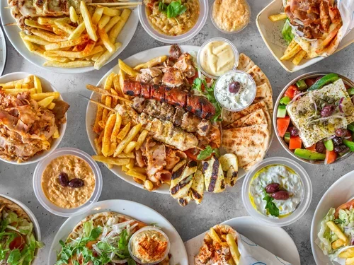 Pork & chicken yeeros, pork & chicken souvlaki, Greek sausage, grilled halloumi, lettuce, tomato, onions, olives, chips seasoned with oregano and paprika, two grilled pitas, homemade tzatziki, and honey secret sauce.